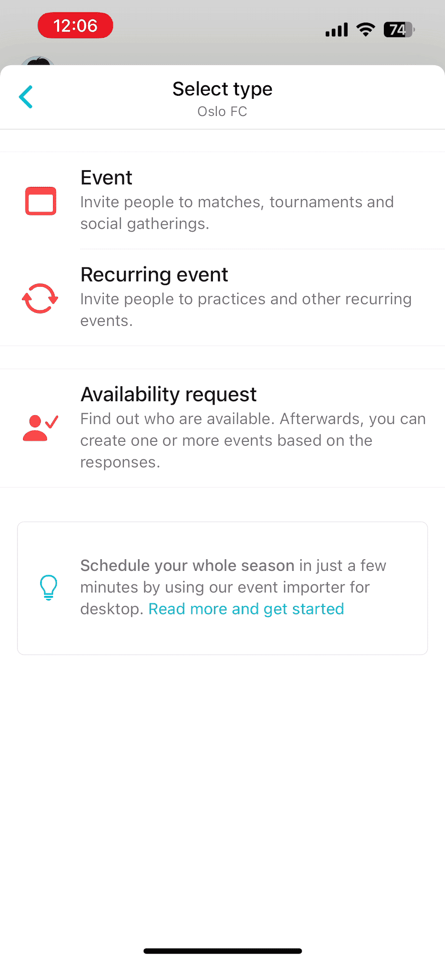 Spond offers different event types; single events, repeating events, season planner, and time poll events.